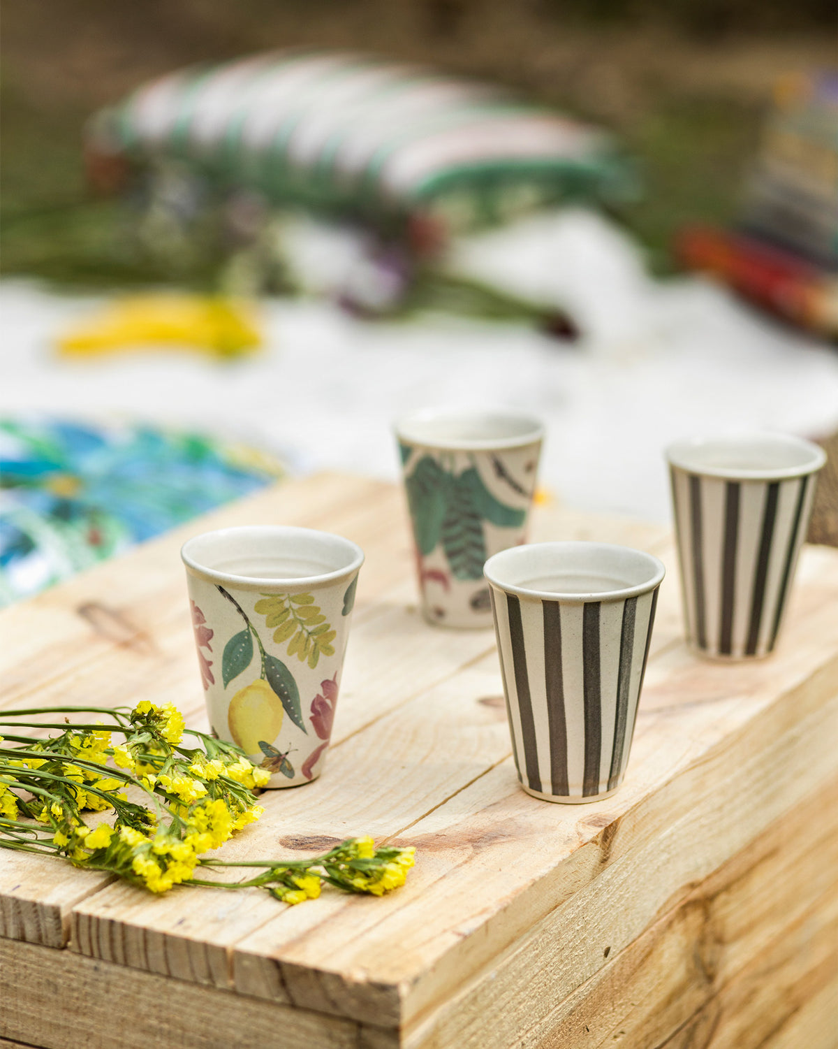 - Crafted in smooth stoneware, our kulhars are printed with motifs inspired by the Coromandel Coast plus our signature stripe