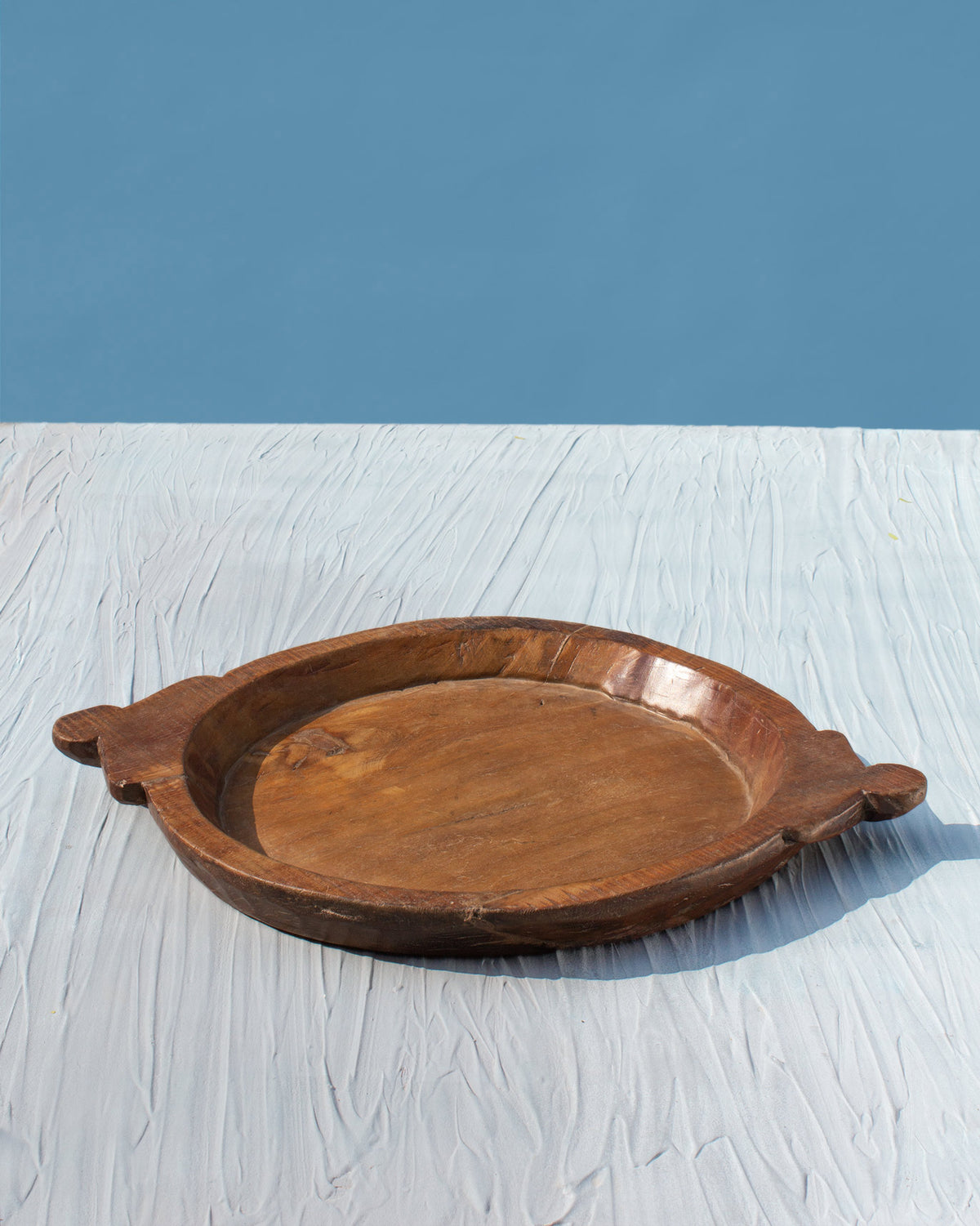 • Inspired by objects found on your faraway travels, this antique wooden gong tray will add an earthy touch wherever it's kept
