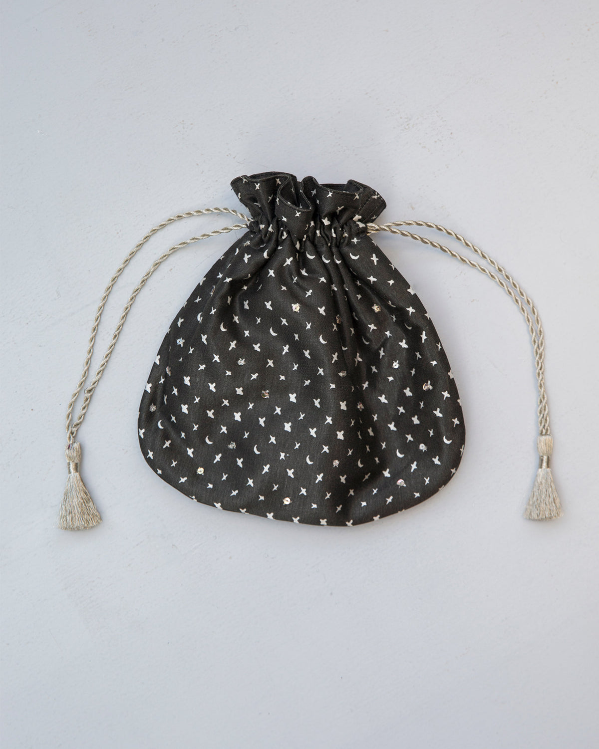 • A modern update on a classic Indian potli bag featuring star and moon motifs and shimmering silver ties