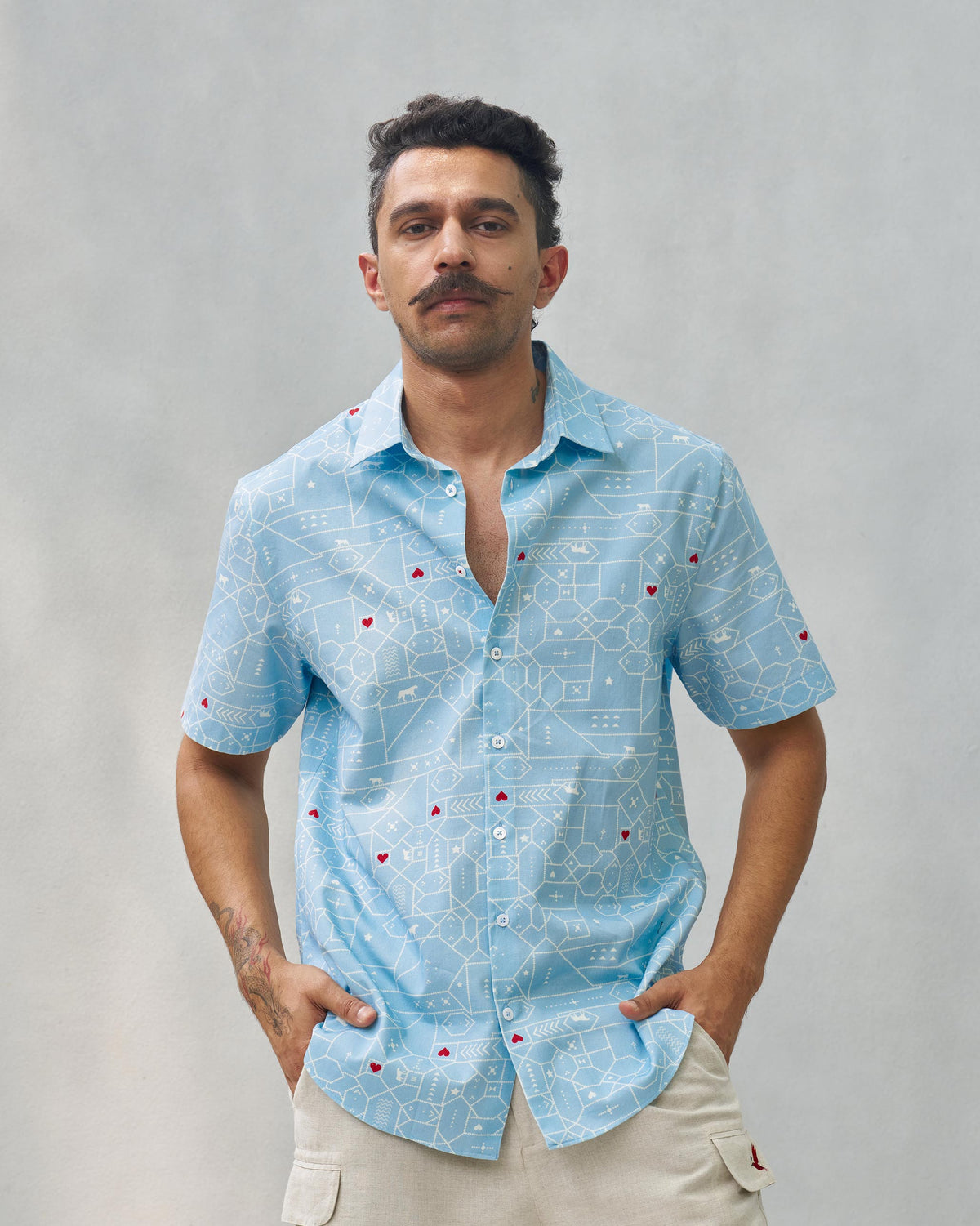 - A classic half sleeve shirt cut in cotton-linen featurring a bright print on a solid blue base.