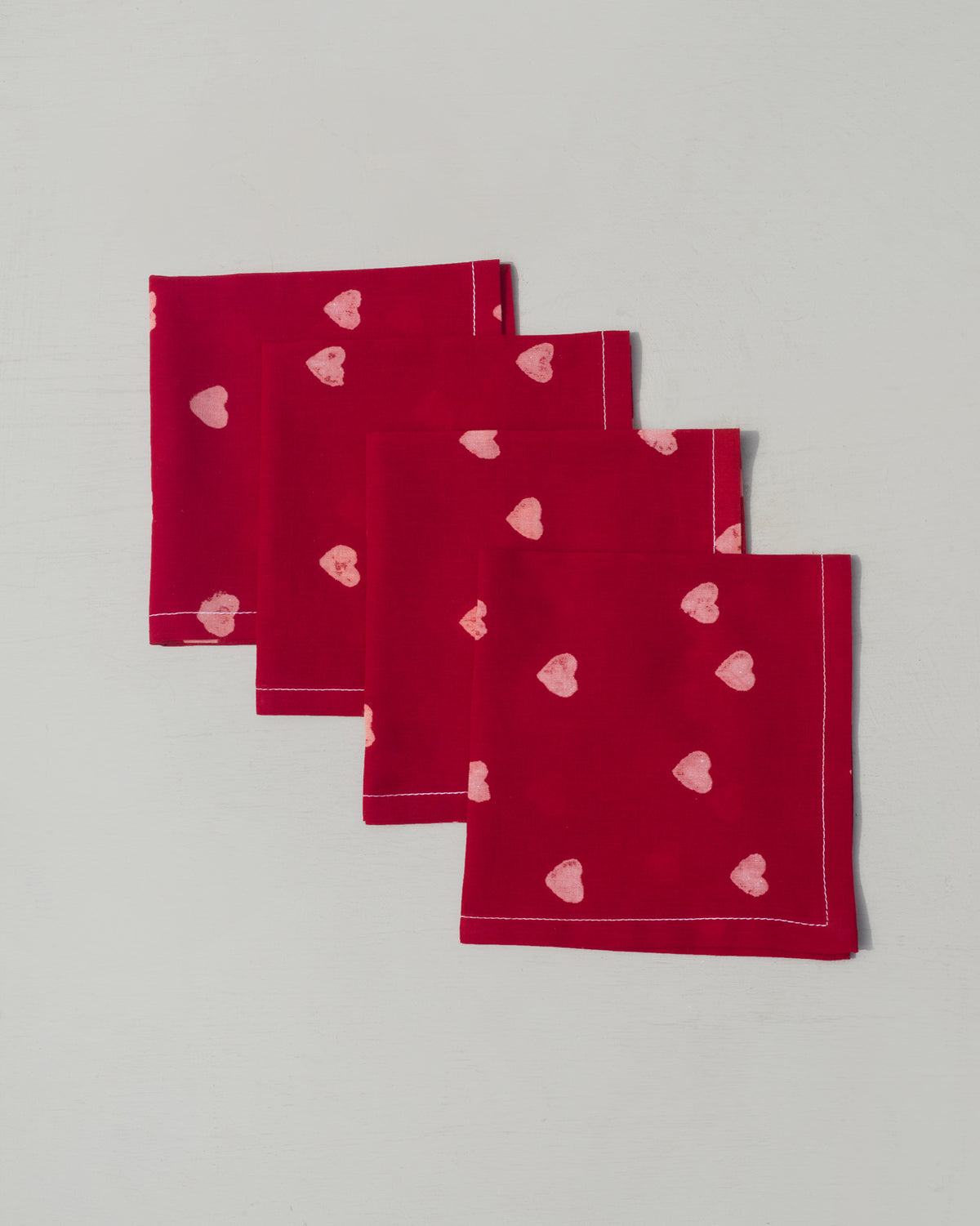 - This is a set of four red cocktail napkins with block printed hearts on them.