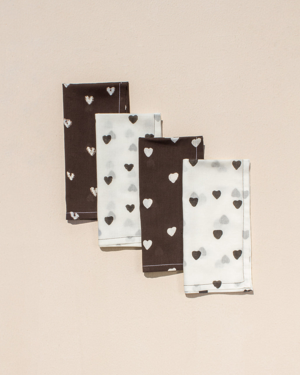 - This is a set of four brown and white dinner napkins with block printed hearts on them to really evelate every table setting.