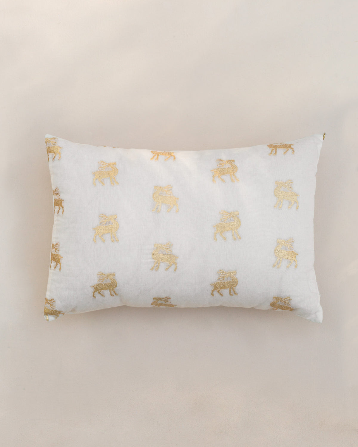 - In buttery chanderi, this is a pared-back but chic cushion with an envelope enclosure and ties, and a brass dragonfly charm on the top right corner.