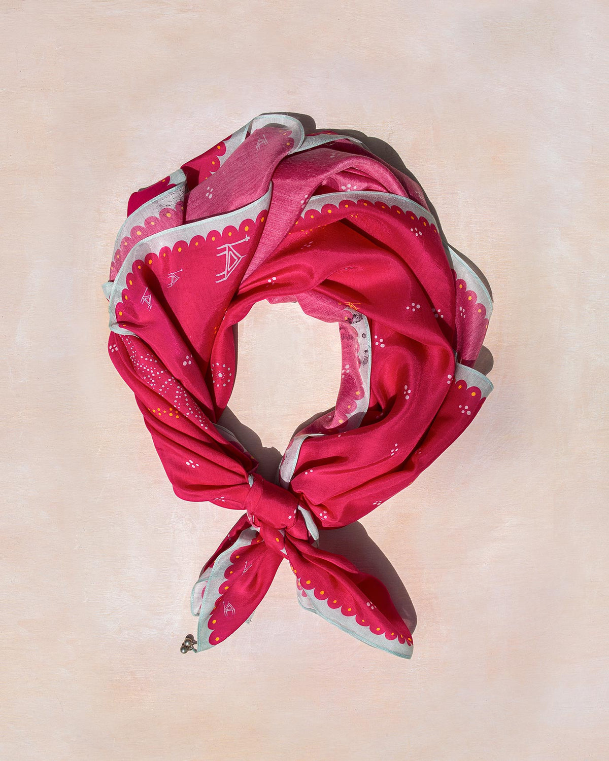 - Inspired by the tattoos worn by the banjaras, this is a pink scarf with a tiny dot print and finished with little bells on two corners