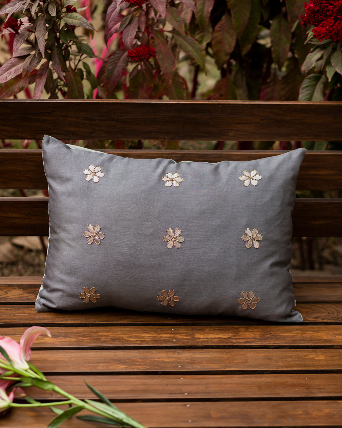 - In soft grey chanderi, this cushion cover is a festive addition to your home with gota patti embroidery at the front and casement fabric along the back