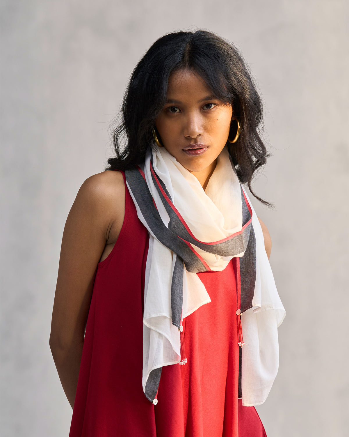 - The Jalsa scarf in sophisticated and seamlessly-blending ivory & grey is the perfect neutral all-season, all-gender accessory.