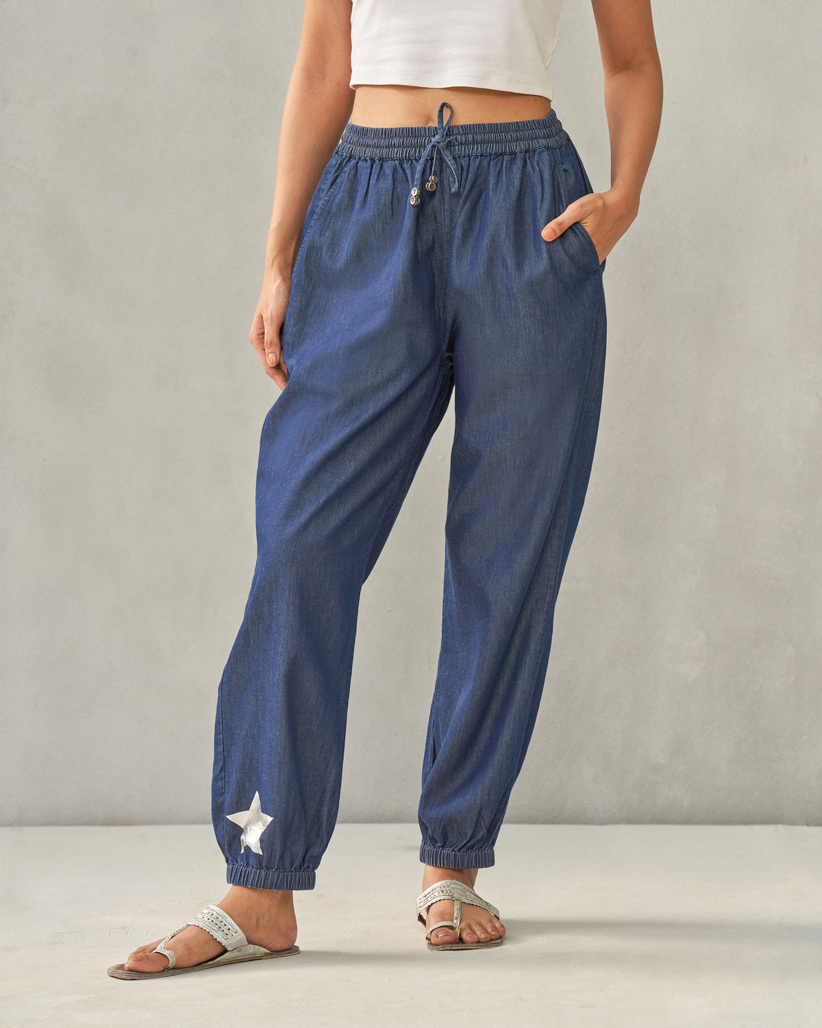 - This pair of cotton pants in deep indigo comes in a relaxed fit with an elastic waistband and drawstring for extra comfort.