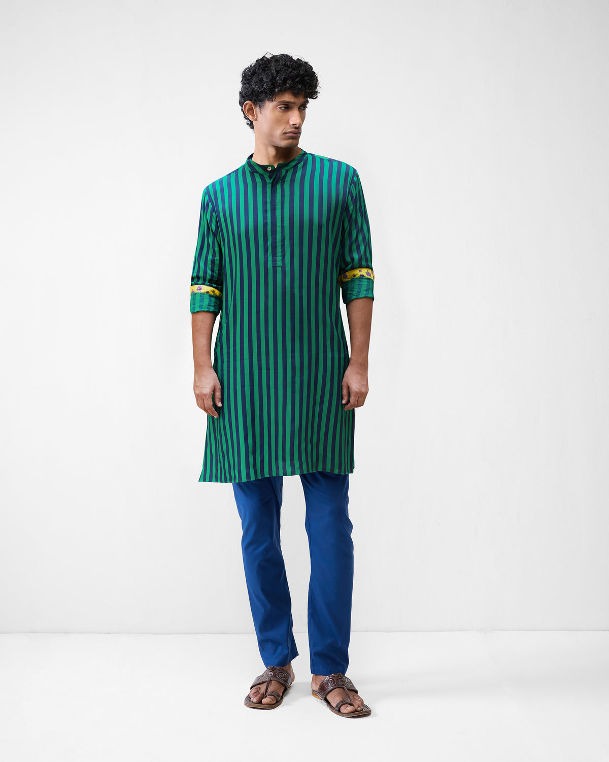 • Cut from a modal-cupro blend, the fabric carries a smooth drape and soft sheen, giving the kurta an elevated finish while staying easy to wear. The fine green and navy stripes lend rhythm and character to the silhouette.