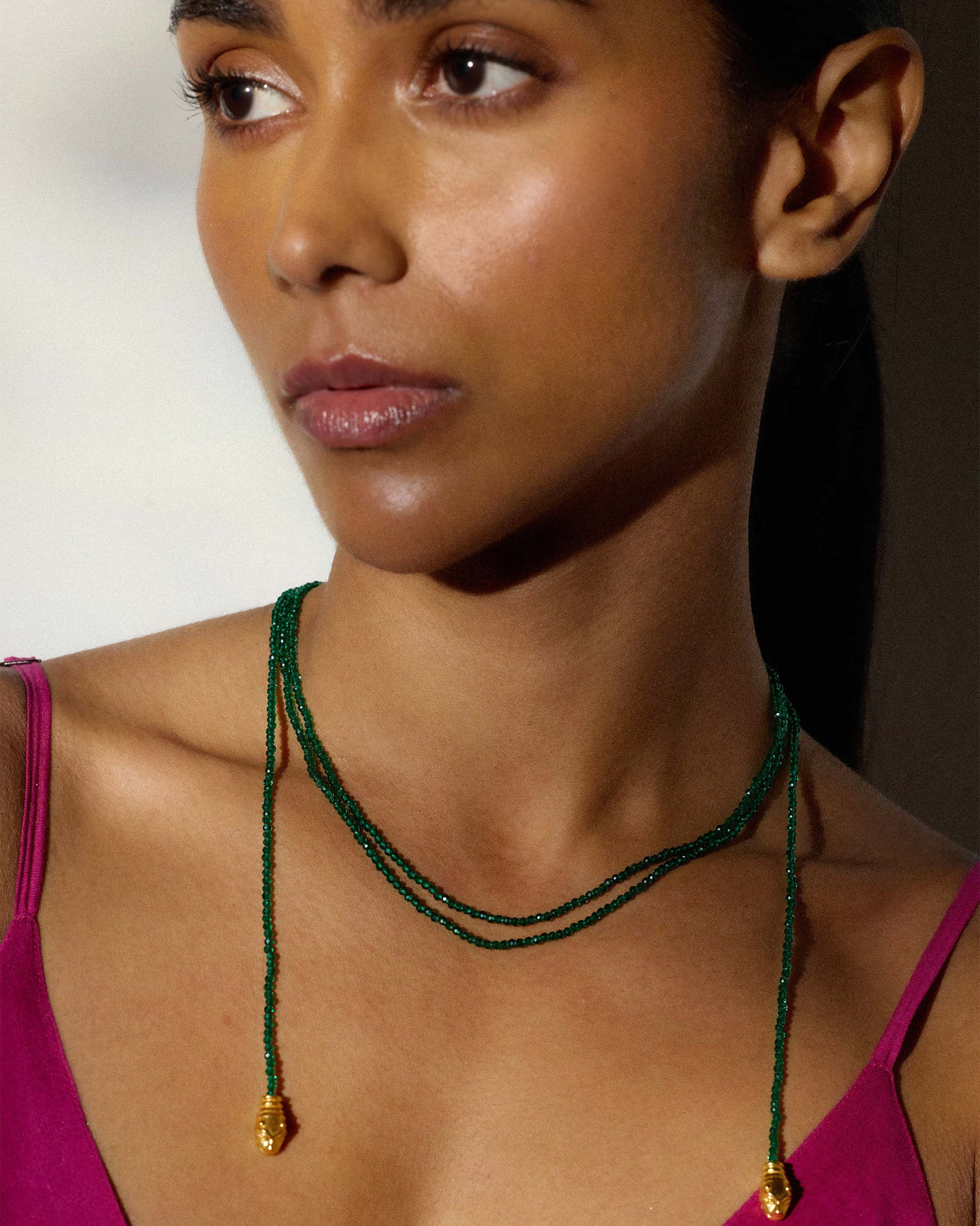 - The scarf-style necklace is strung with striking green glass to add a touch of whimsy.