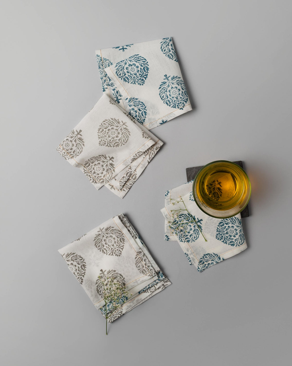 - Gossamer thin, super soft, and with the prettiest block printed detail, this set of 6 napkins features two colours - charcoal on an ivory base, and indigo