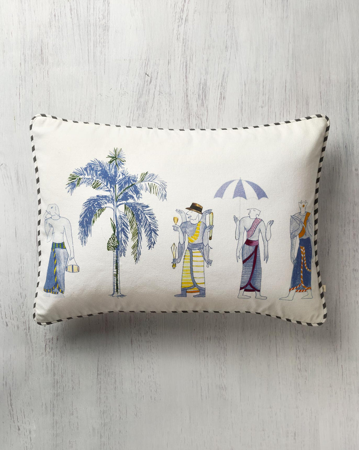 - Peppered with palms, pineapples and a procession of people, this cushion cover features black and white candy stripe cord piping and an envelope enclosure with handy ties