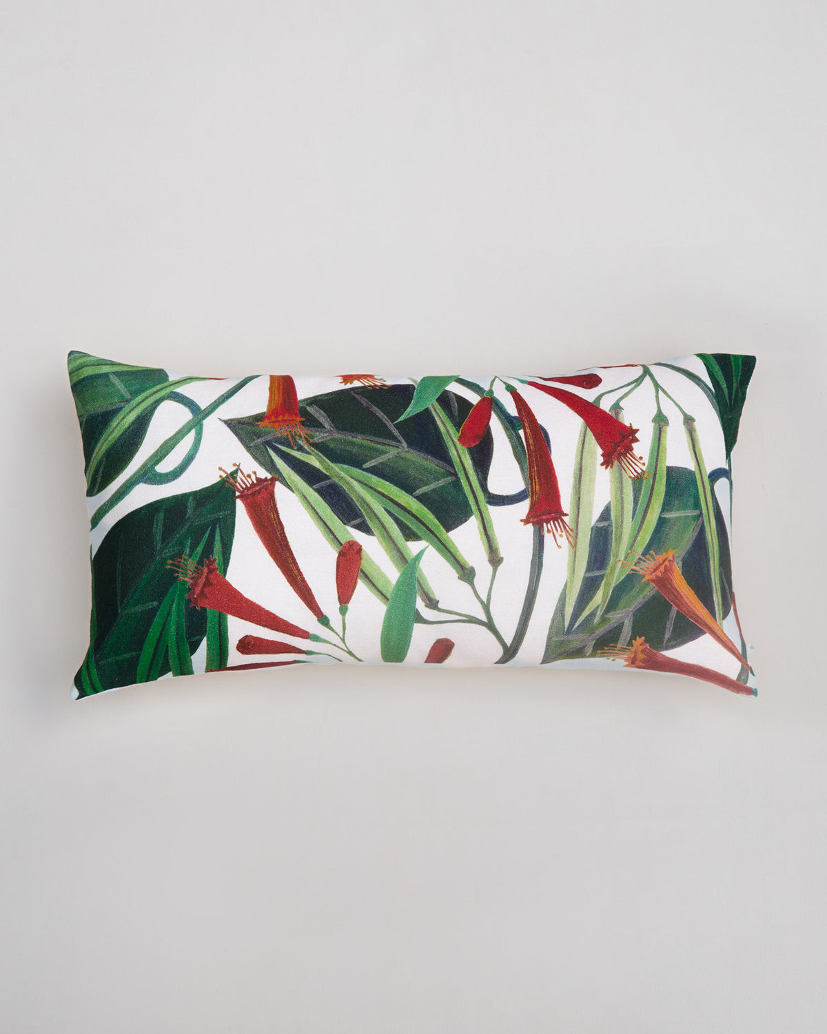 - A lumbar cushion suited for every nook in your home, this tropical one comes in white cotton moss with splashed of crimson and green