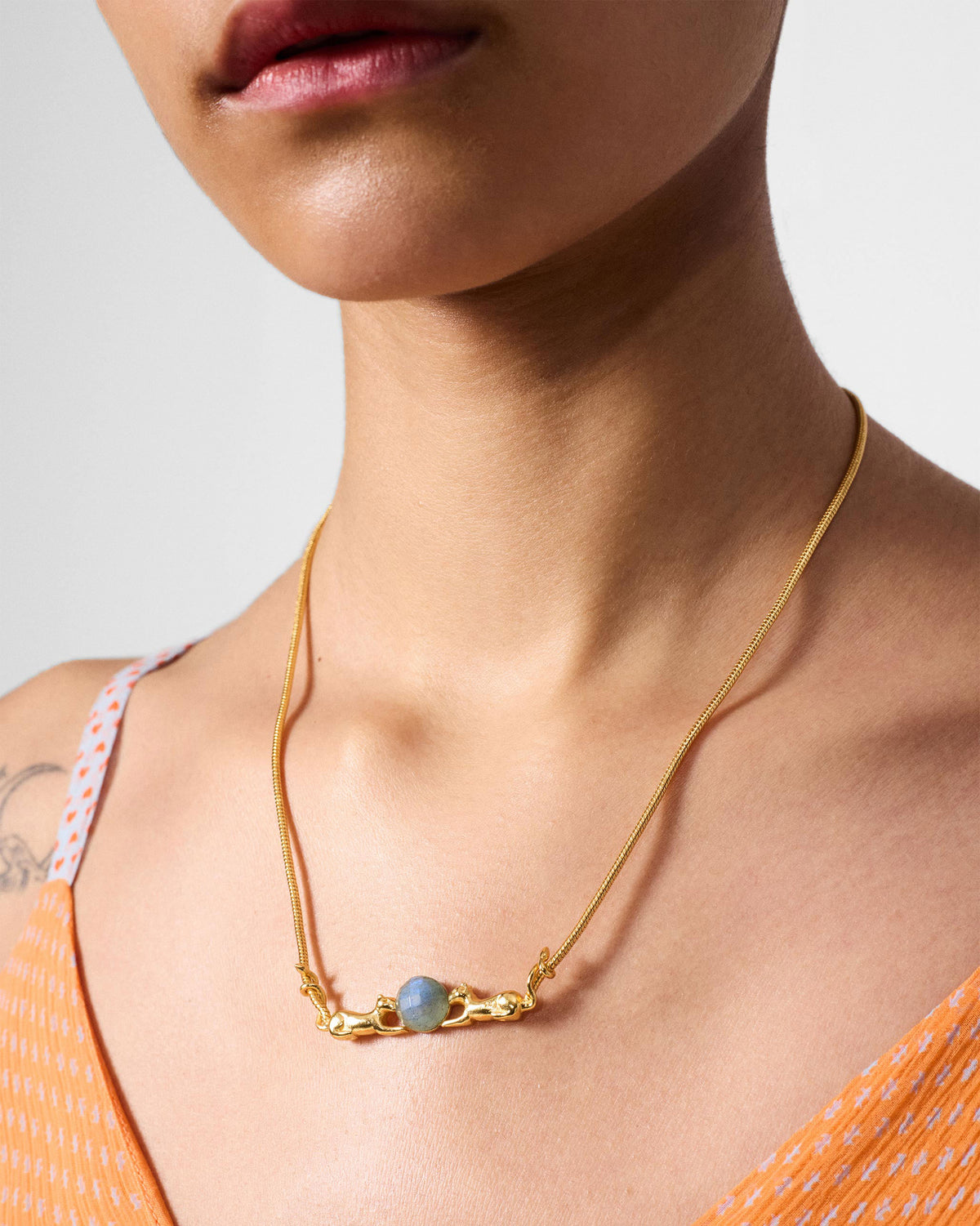 - Made in brass, gold plated, and accented with labradorite, the necklace combines elegance with symbolic strength.