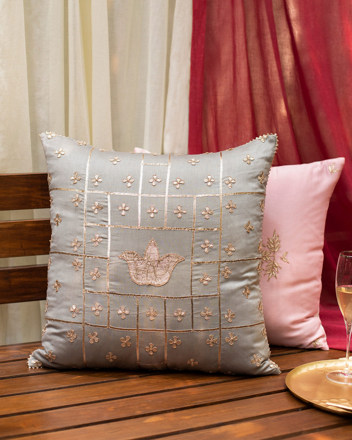 - Handcrafted in chanderi, this is an eye-catching yet pared-back cushion cover with intricate gota patti embroidery
