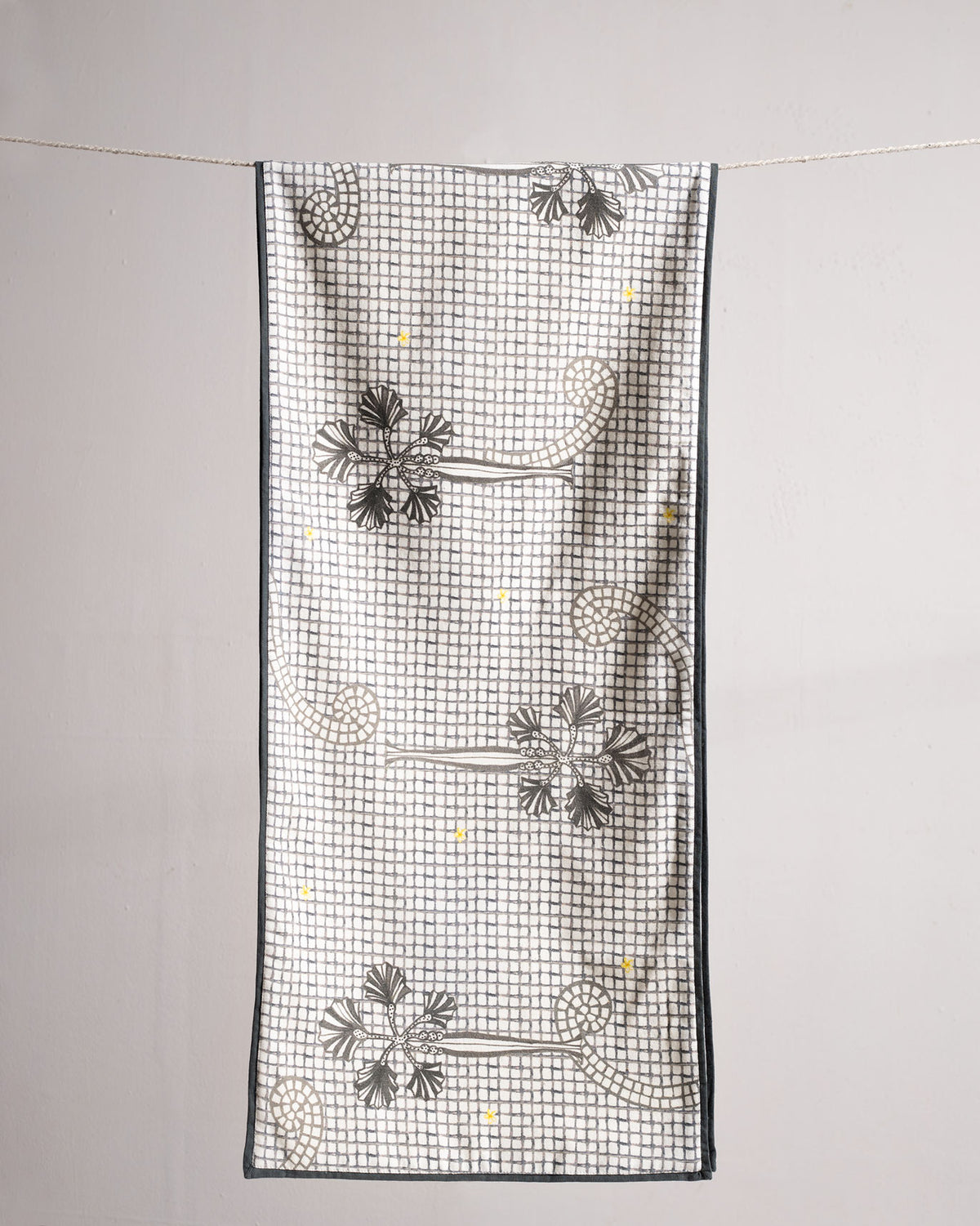 - Our digi printed Madagascar runner features palm trees on top of graphic white and grey checks