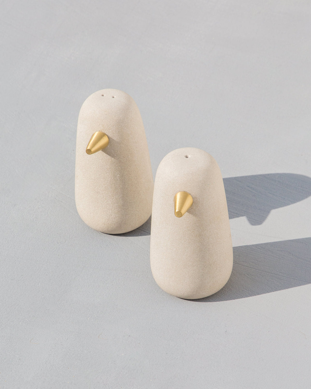 - Like two penguins guarding your table, these salt & pepper shakers, crafted in sandstone and brass, are sure to make your dining experience a little more fun.
