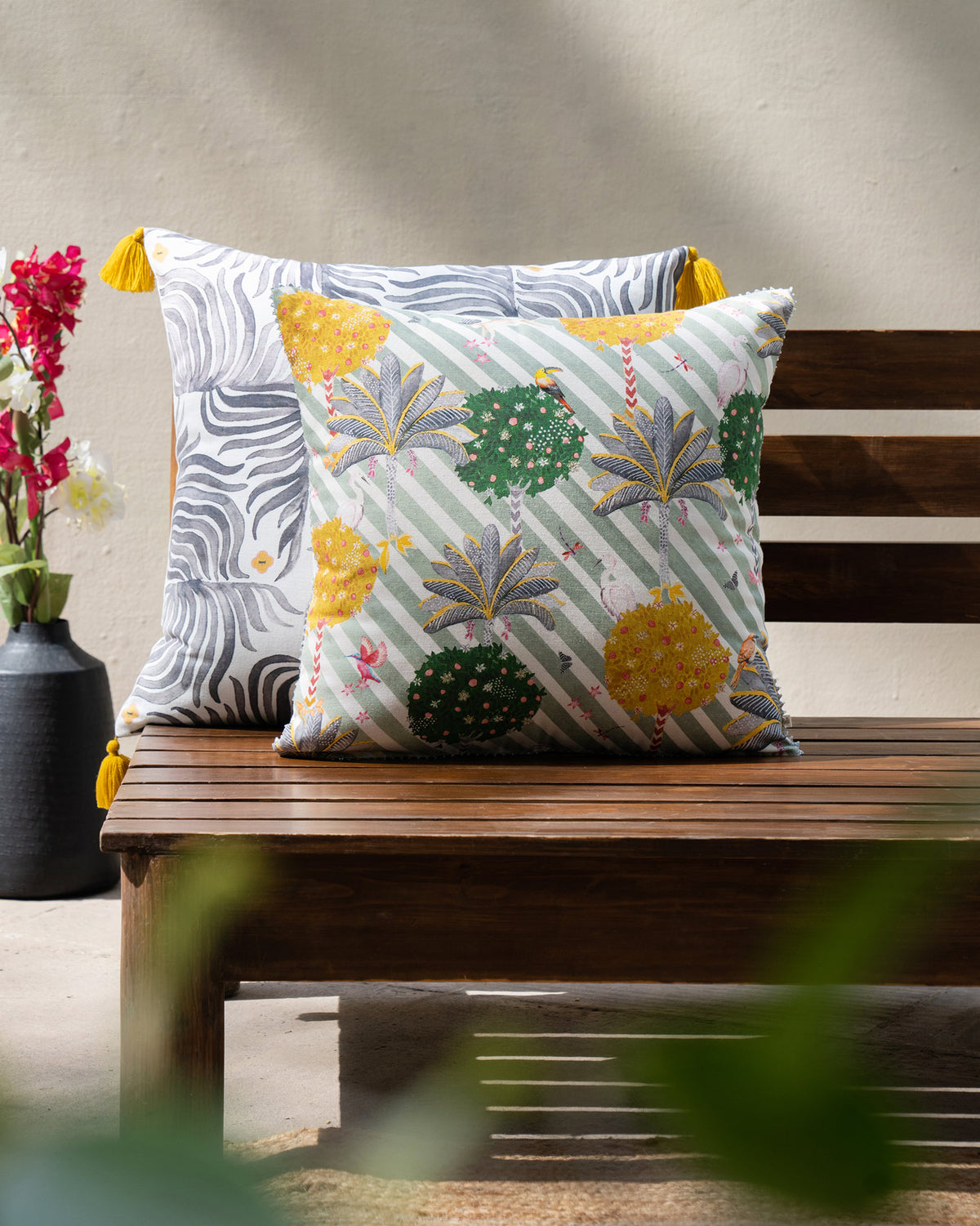 • This cushion cover is all about a summer refresh. It features brightly coloured flora and fauna motifs inspired from Cambodia.
