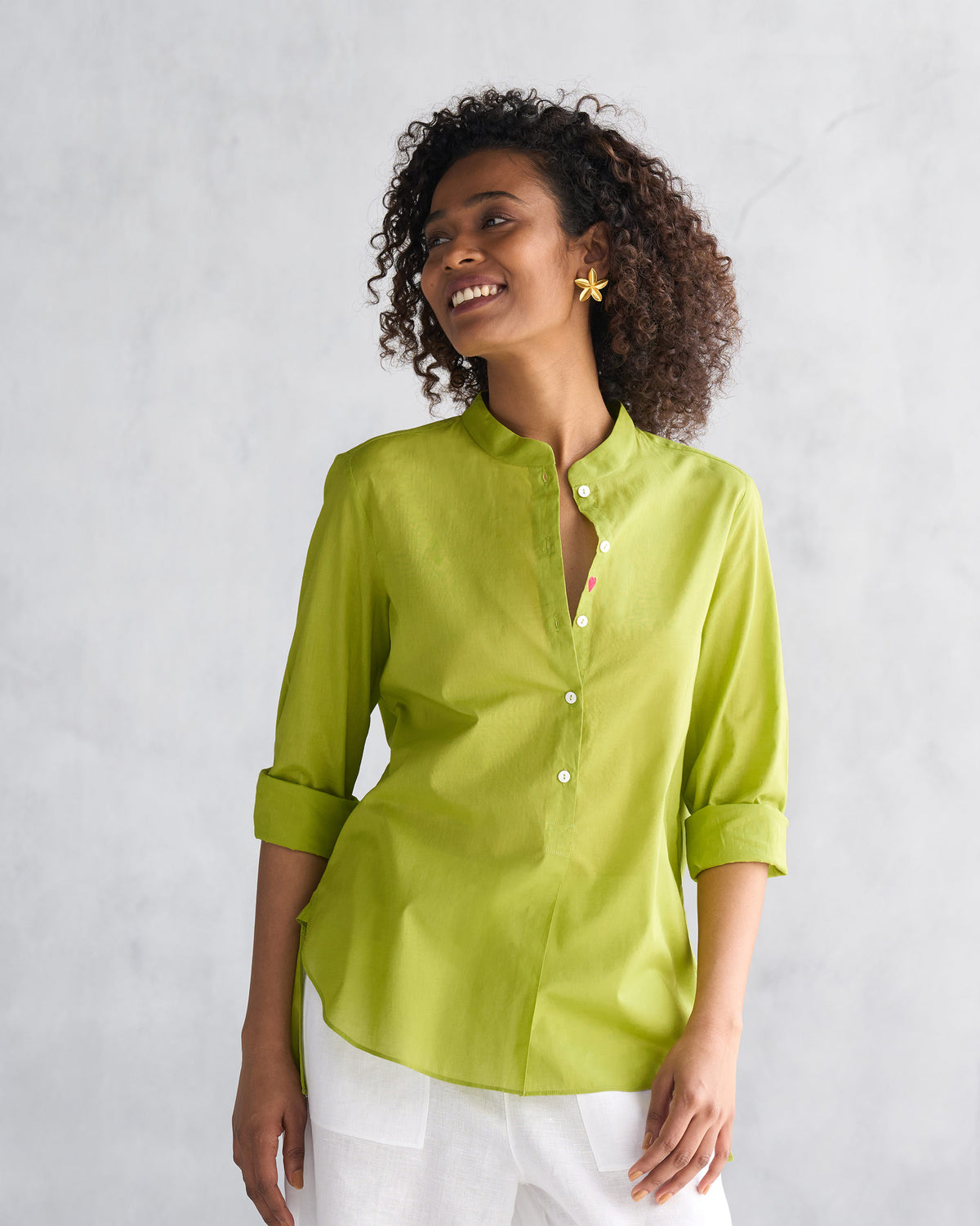 - The mandarin collar adds uniqueness to this wardrobe staple, while the embroidered heart on the placket adds a subtle yet playful detail. Don't miss the joyous parrot embroidery at the back!