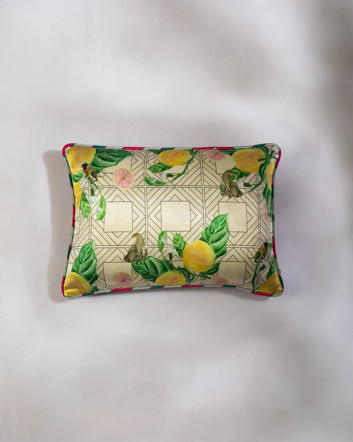 • Our ivory Mandarin Cushion with multi colored stripe piping around the corners