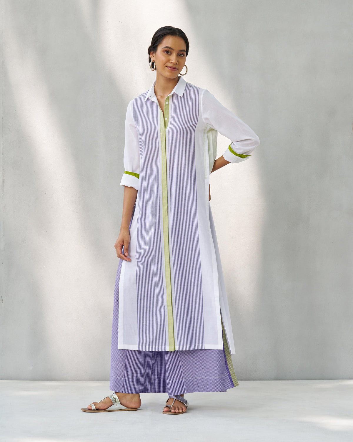 - Our Many Moons Kurta is the perfect pick for breezy, summer days. The crisp white silhouettes sports pops of lime and purple down the centre in pleasing, statement stripes.