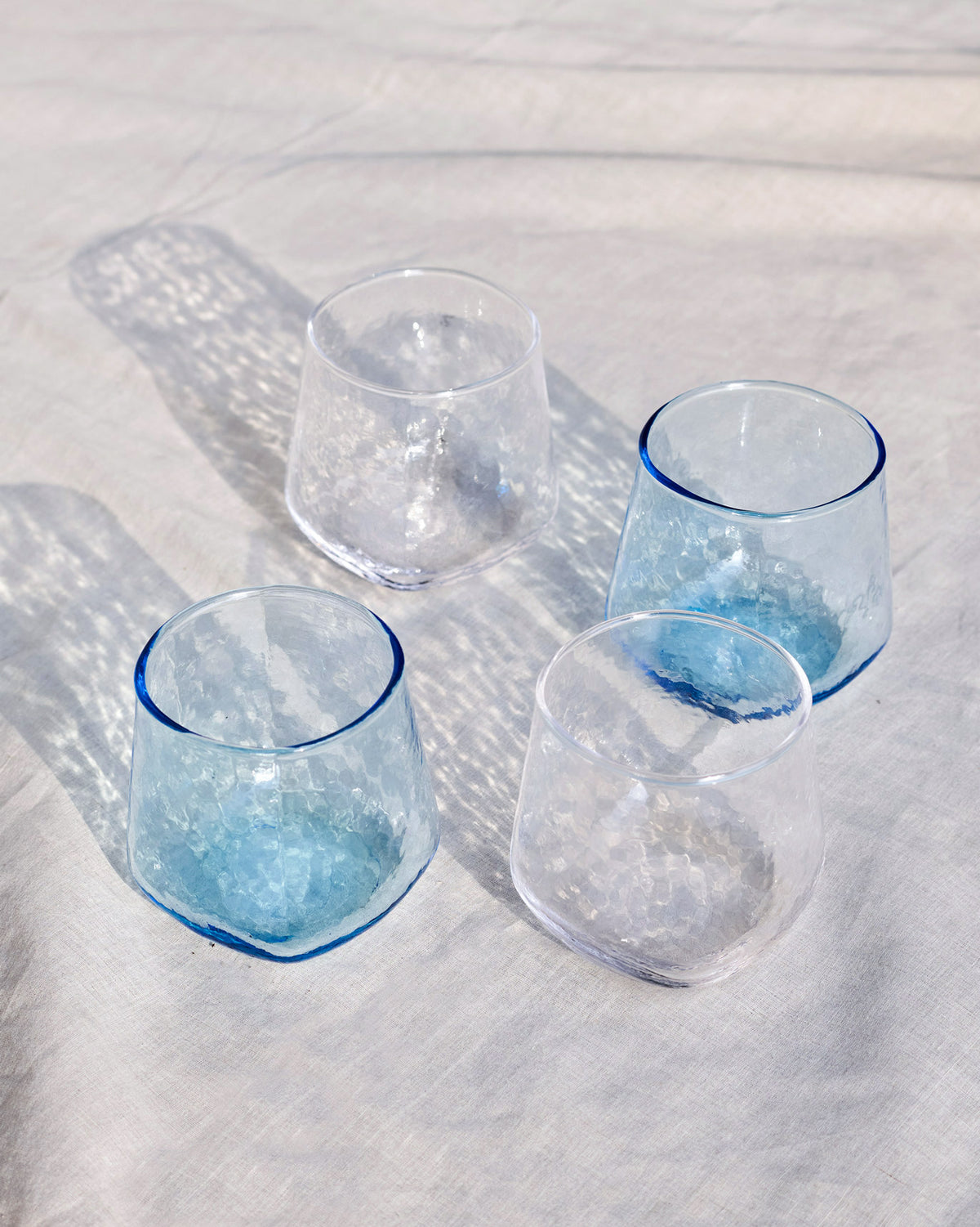 - A classic set of four glass goblets in clear and cool blue tint