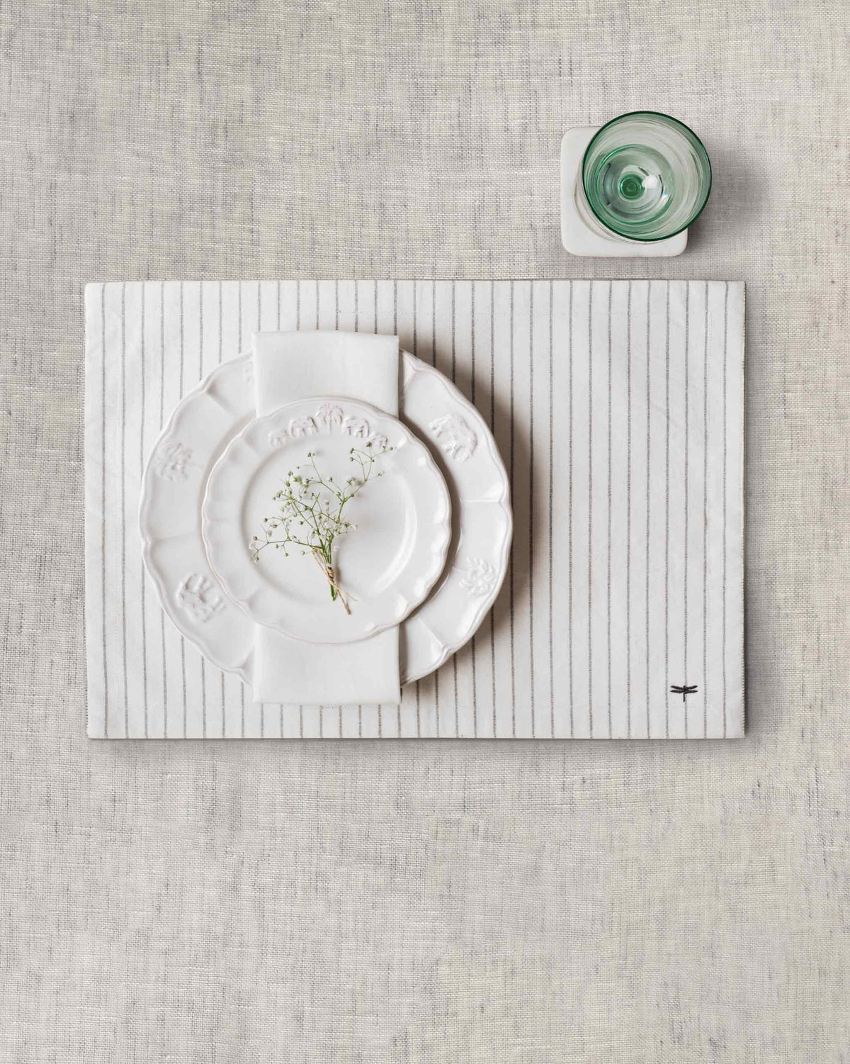 - We're big on details and our Massugu placemat set in ivory and charcoal organic cotton, comes with a dragonfly sewn onto the edge and delicious charcoal piping along the back