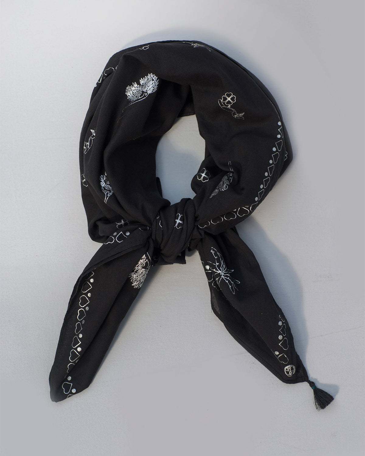 - Add a hint of shimmer to your outfit with this silver foil-printed scraf, kitted out with tassels along two opposite corners.