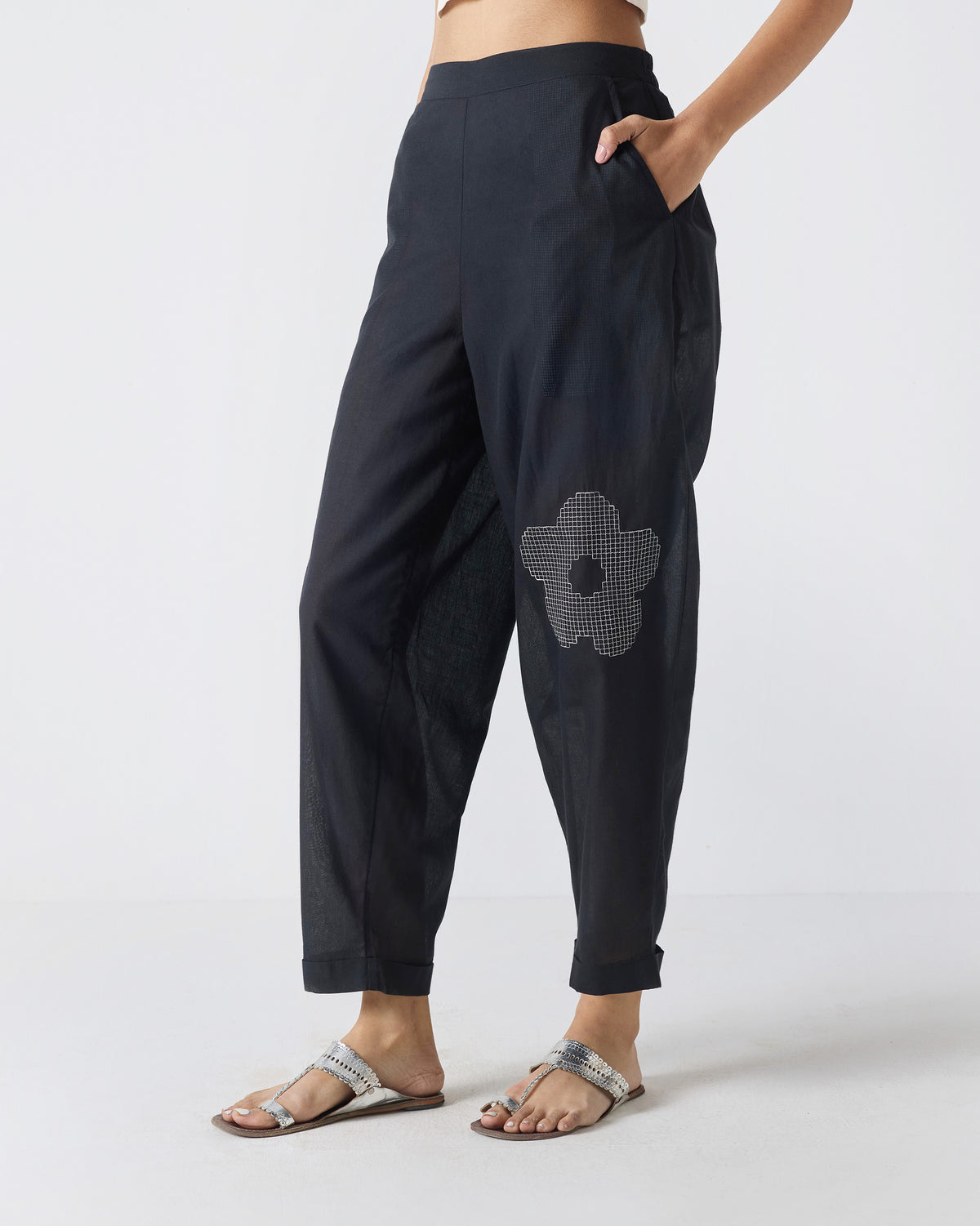 - The floral embroidery stands out in these comfortably fitted pants offer timeless appeal.