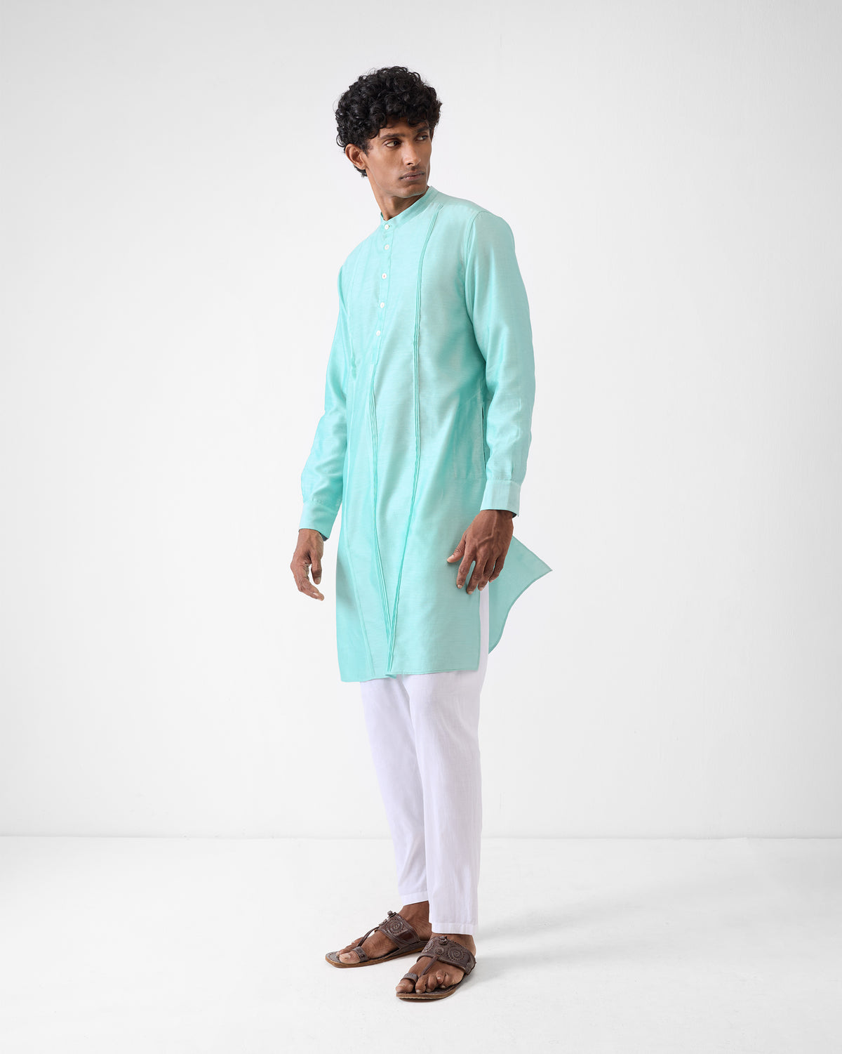 - In a light sea blue hue, the Naaz Kurta in cotton-silk Chanderi features a soft, dual-toned finish and is fully lined.
