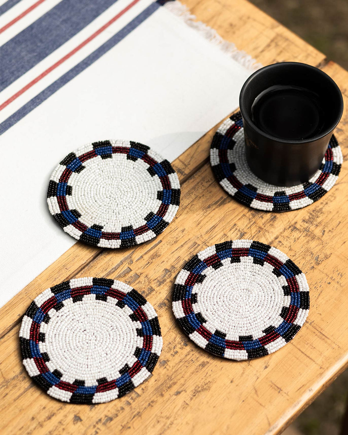 - Beaded with multicoloured beads, our coaster will meld with all sorts of table settings and will protect your wooden surfaces from water stains