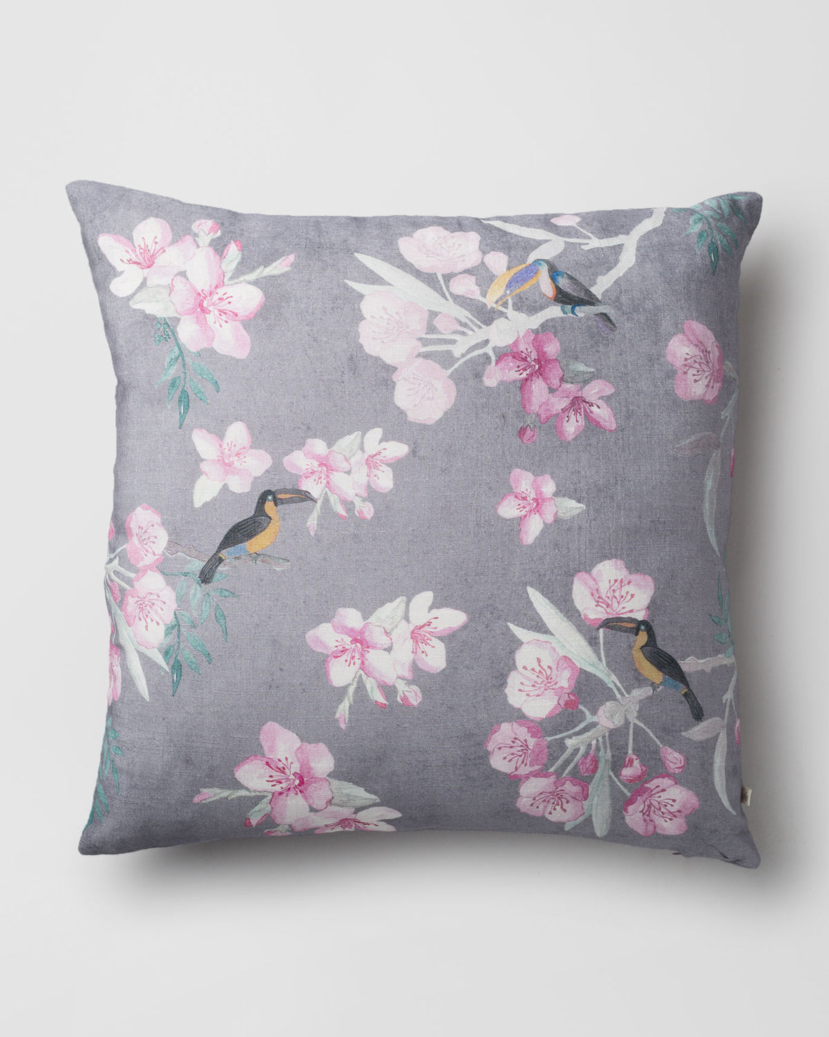 • The gauzy handfeel of tussar meets lush foliage, cherry blossoms and the odd toucan in watercolour-like patterns on our Nakano cushion in muted grey