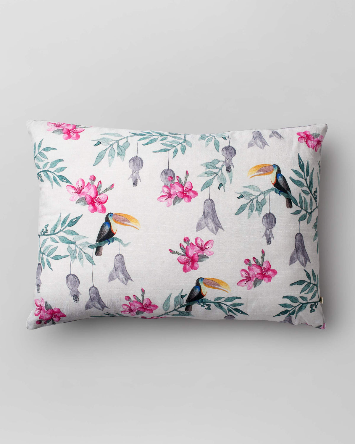 - The gauzy handfeel of tussar meets lush foliage in muted grey, cherry blossoms and the odd toucan in watercolour-like patterns on our Nakano cushion in ivory