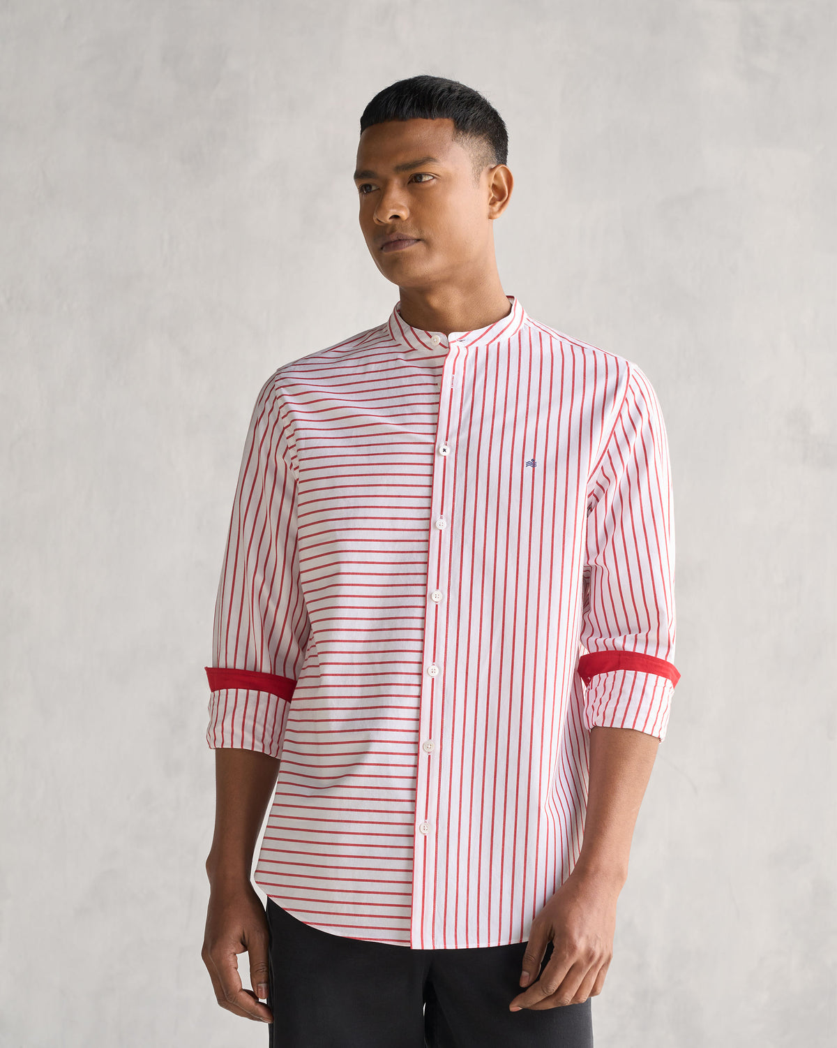 - While embracing modern trends, the Nawab Shirt with a Nehru collar shirt pays homage to tradition. The slim fit and playful stripe design bring a contemporary edge.