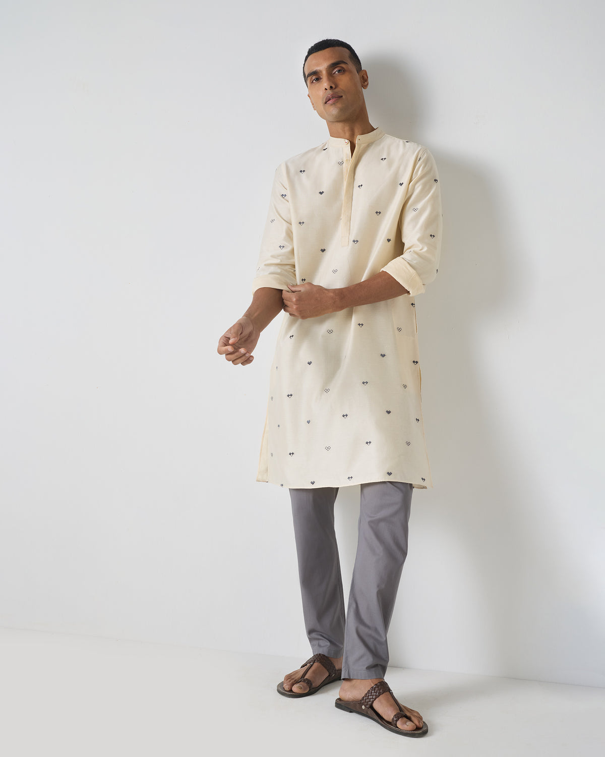Neckband Kurta - Ivory & Charcoal Embroidered