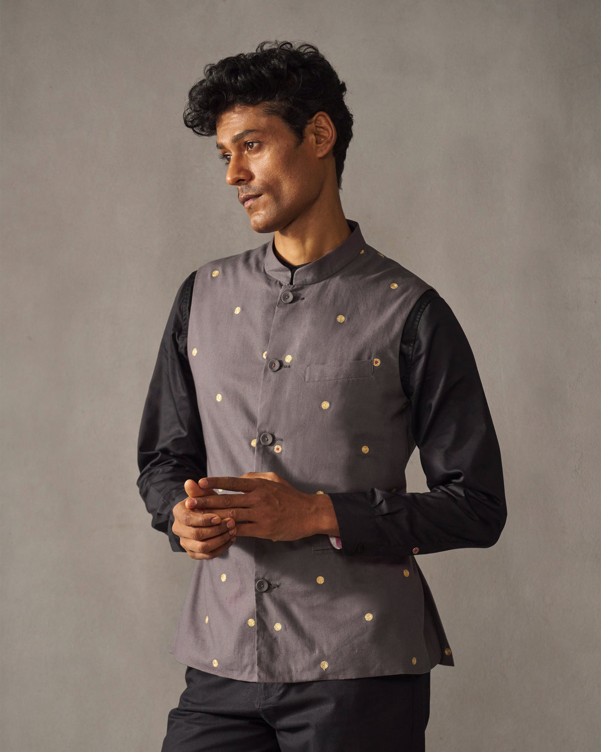 - Our token to tradition in our menswear collection, this Nehru jacket is crafted in comfortable cotton linen. This Nehru jacket features dotted gold zari embroidery against a charcoal background.