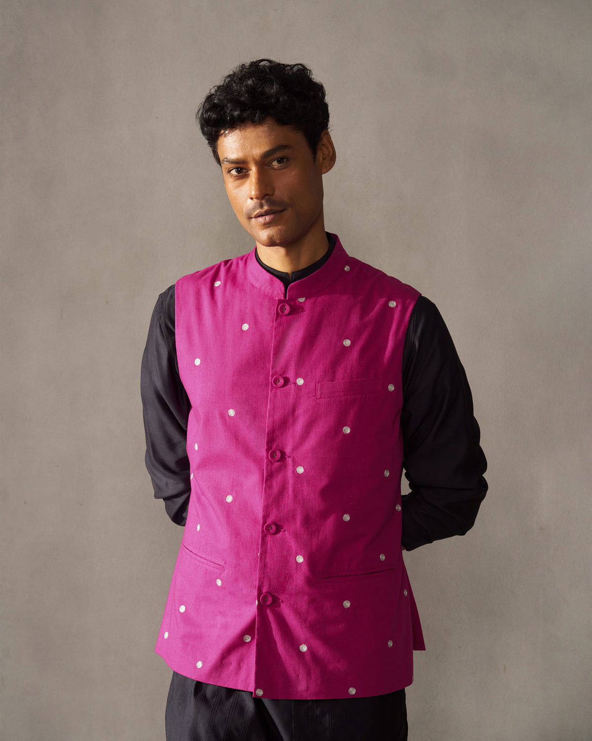 - Our token to tradition in our menswear collection, this Nehru jacket is crafted in comfortable cotton linen. This Nehru jacket features dotted golden zari embroidery against a magenta background.