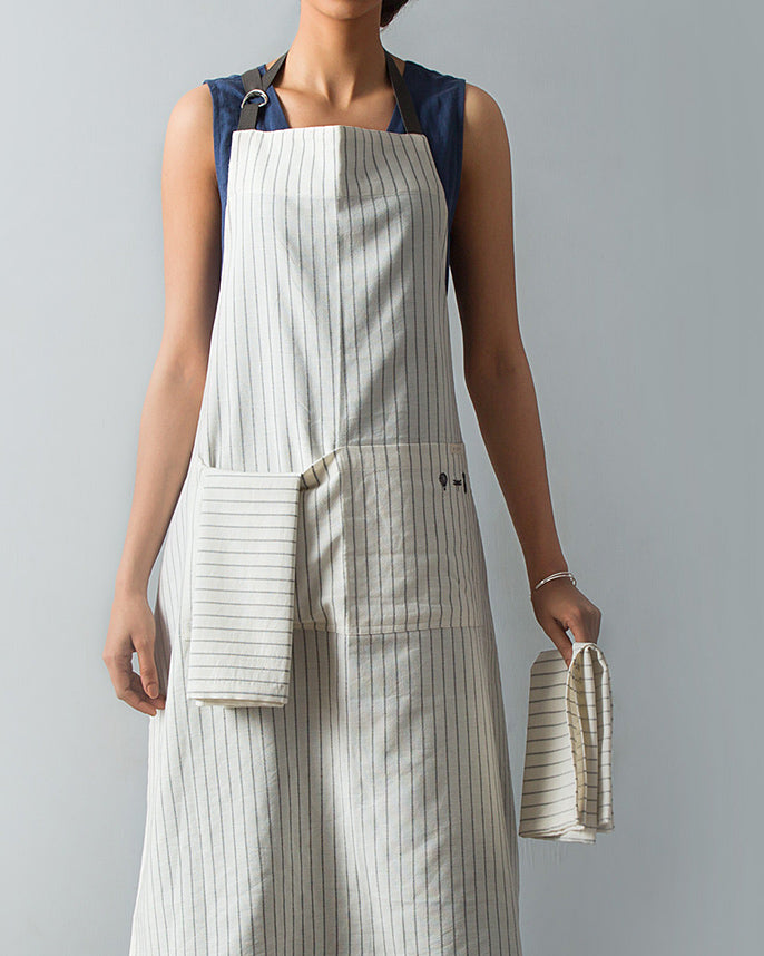 - Our minimal grey and white striped apron will keep you looking as delightful as the treats coming out the kitchen