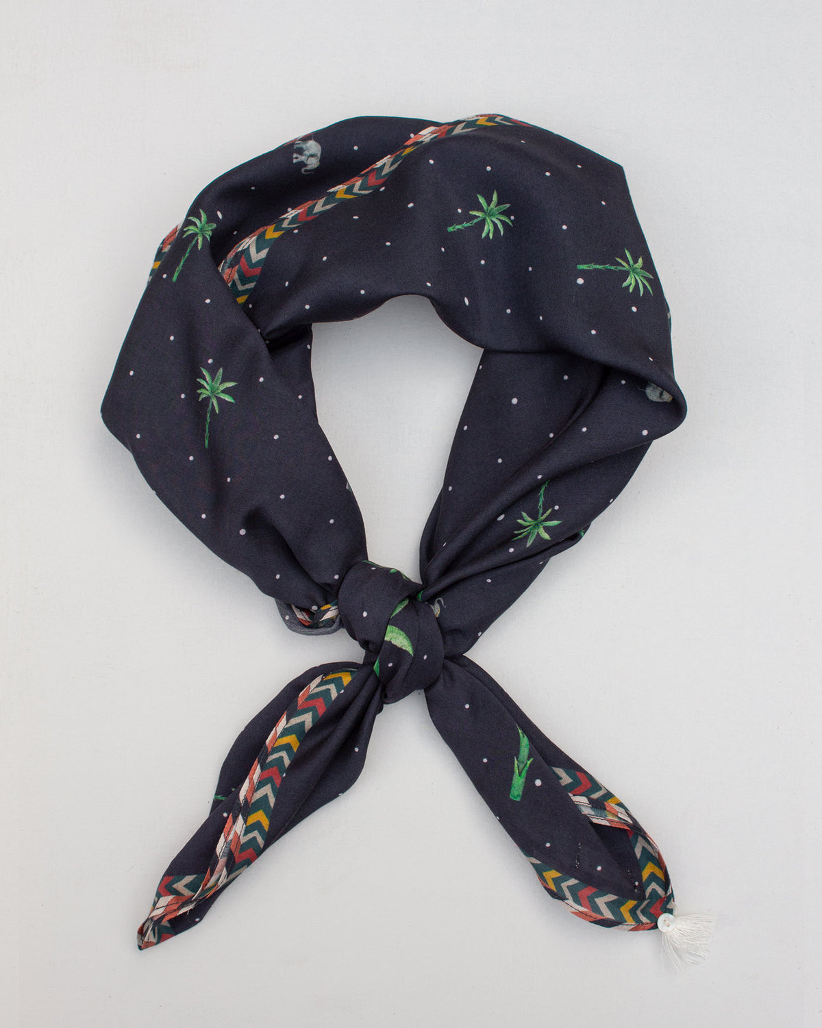 - A playful safari-themed scarf with elephants frolicking amidst palm trees against the night sky.