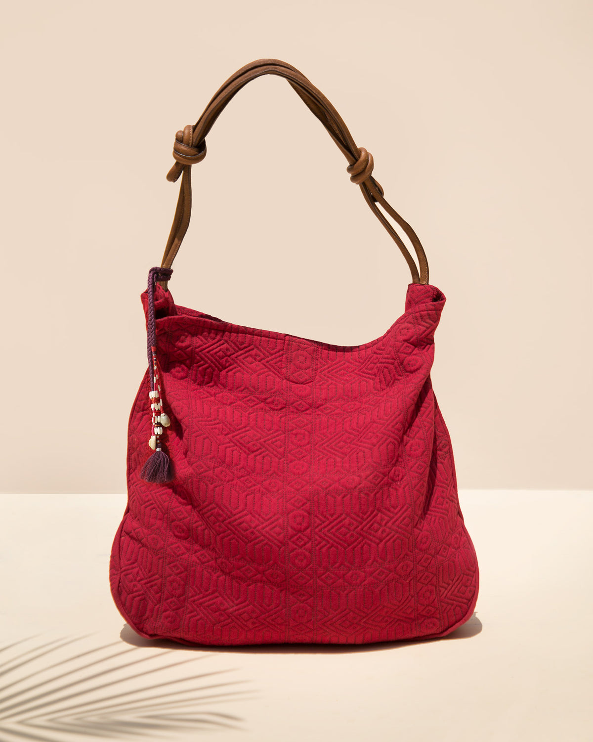• In bright red, this handy tote has a PU cord handle, an adjustable tassel, and a gunmetal snap button.