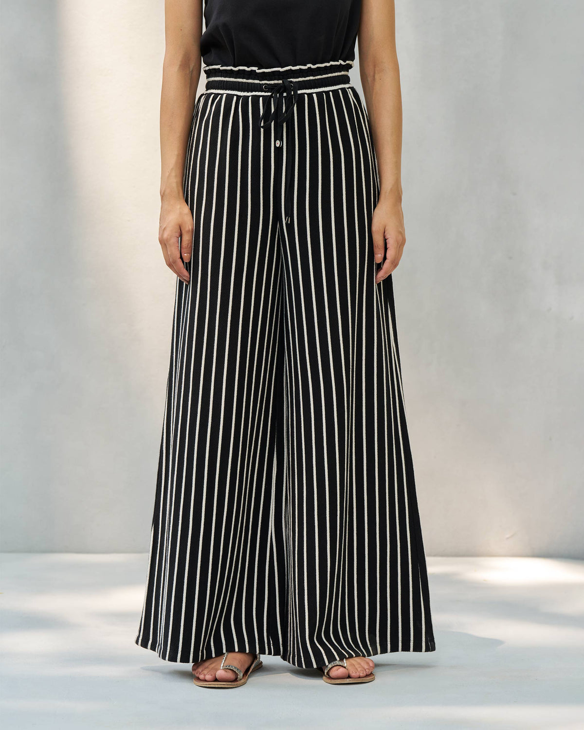 • These flare pants feature a comfy paper-bag waistband to seamlessly fit into in a striped pattern.
