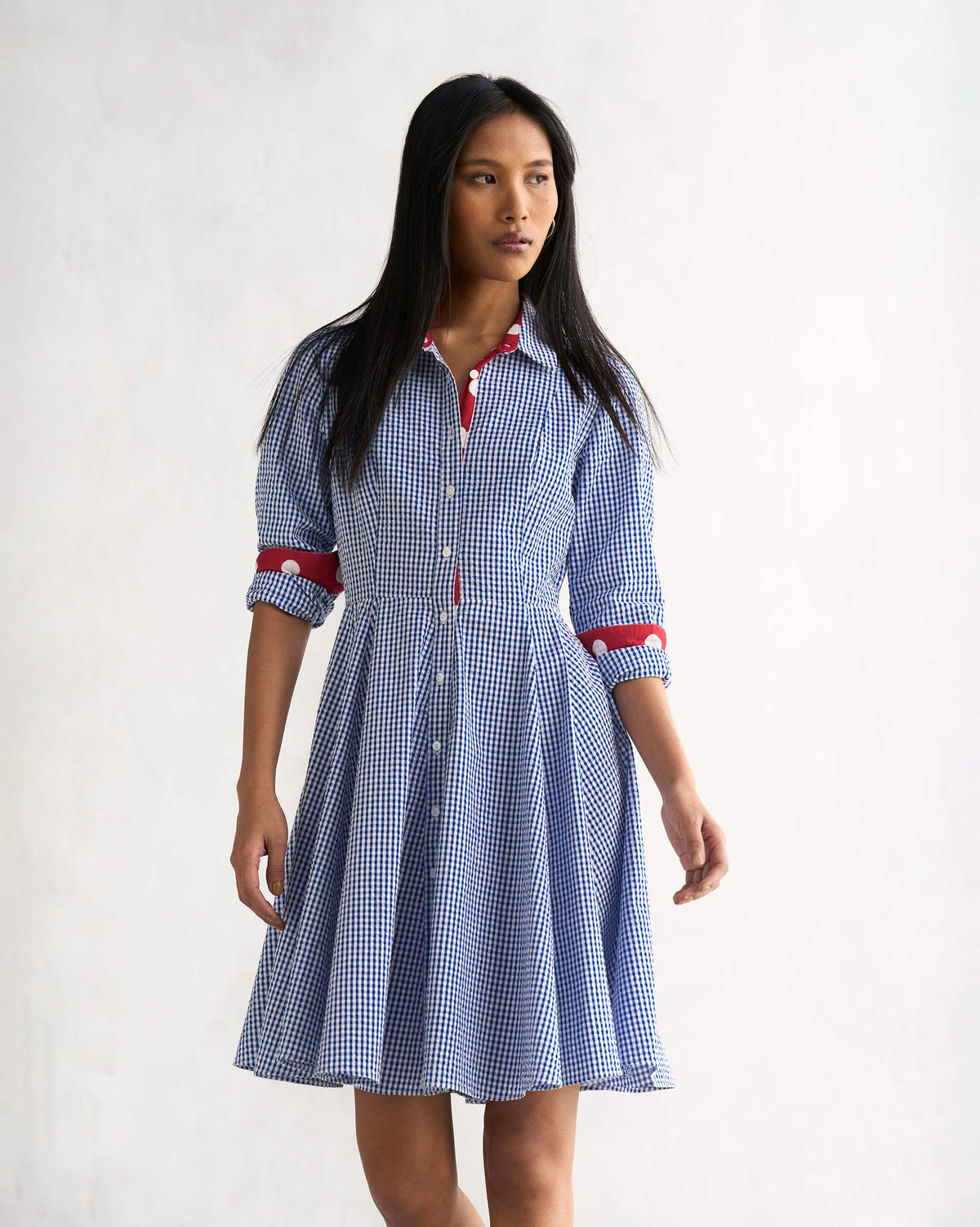 • In bright blue and white checks inspired by our travels to Zanzibar, the Nungwi Shirt Dress is a classic addition to wardrobes.The flared fit lets you sail into boardrooms and brunches with ease.