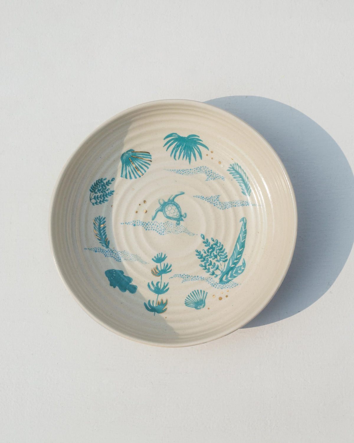 - Our stoneware shallow bowl in ocean blue and gold comes peppered with beautiful motifs from the ocean, guaranteed to delight you with every serving