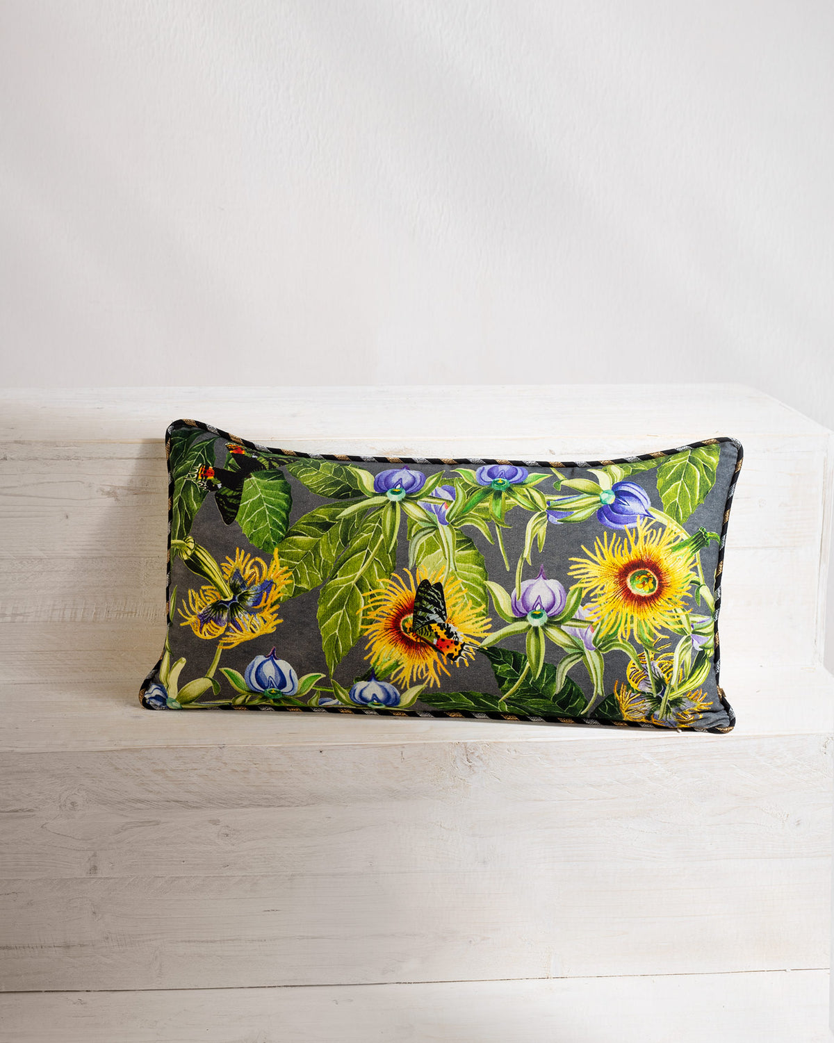 - Inspired from the flora of Madagascar, this digi printed cushion in cotton duck features orchids and telfairias on the front and back