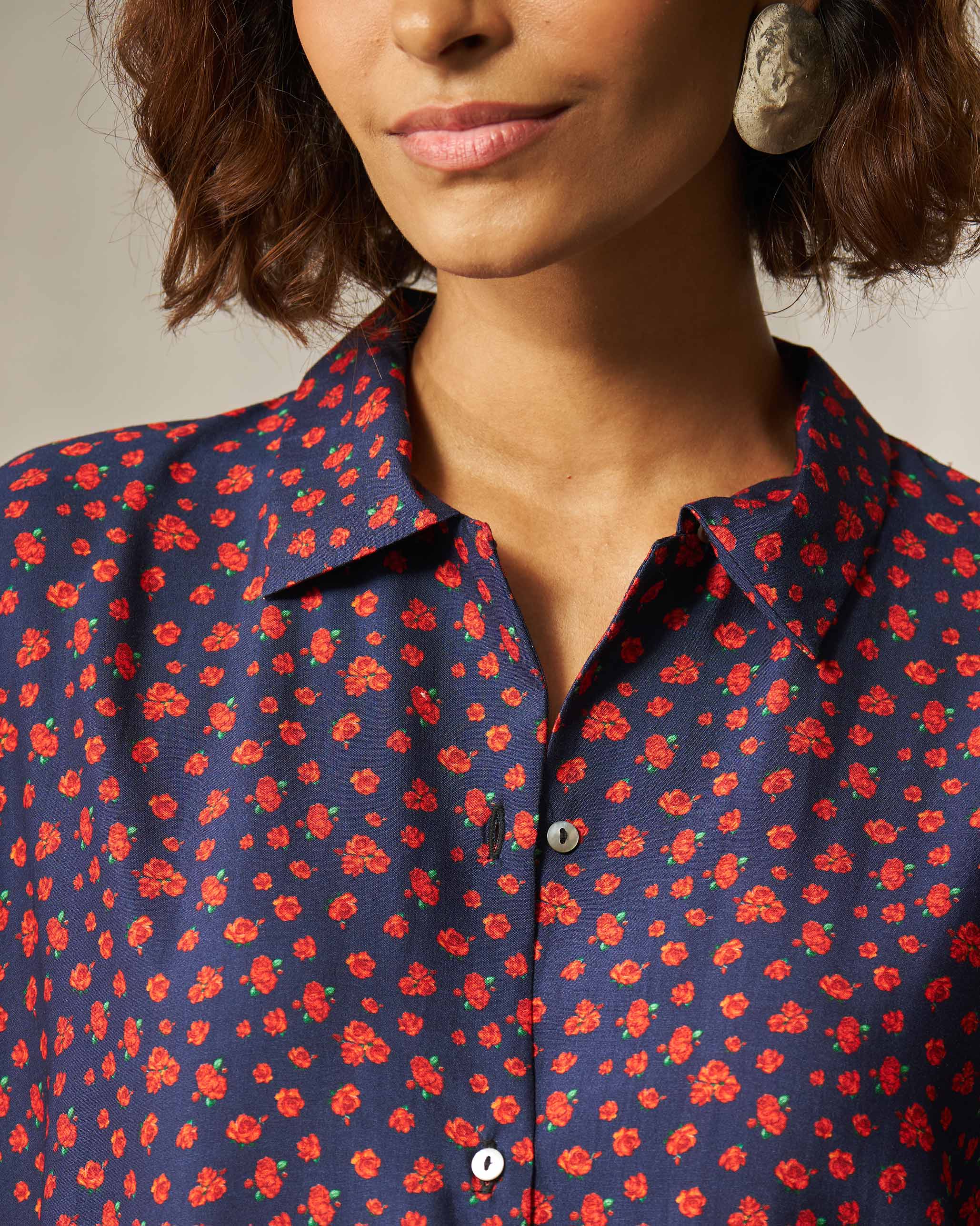 - Inspired by our travels to Morocco, the Oversized Shirt features a sea of rose chintz against a rich navy base. Roses are central to Moroccan culture, symbolizing love, beauty, and purity, and are prominently featured in weddings, festivals, and religious ceremonies.