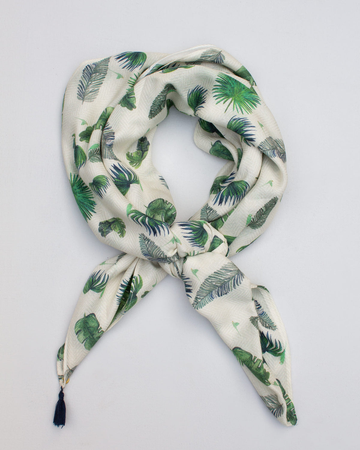 - Bring a bit of nature into your wardrobe with this scarf featuring flourishing green foliage.