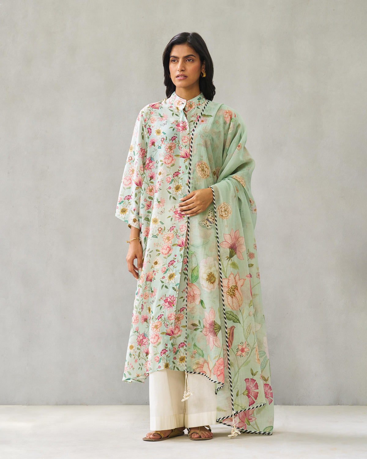 - The Gul Dupatta stands out with its contemporised ivory and green chintz print, bright and floral in free flowing cotton silk.