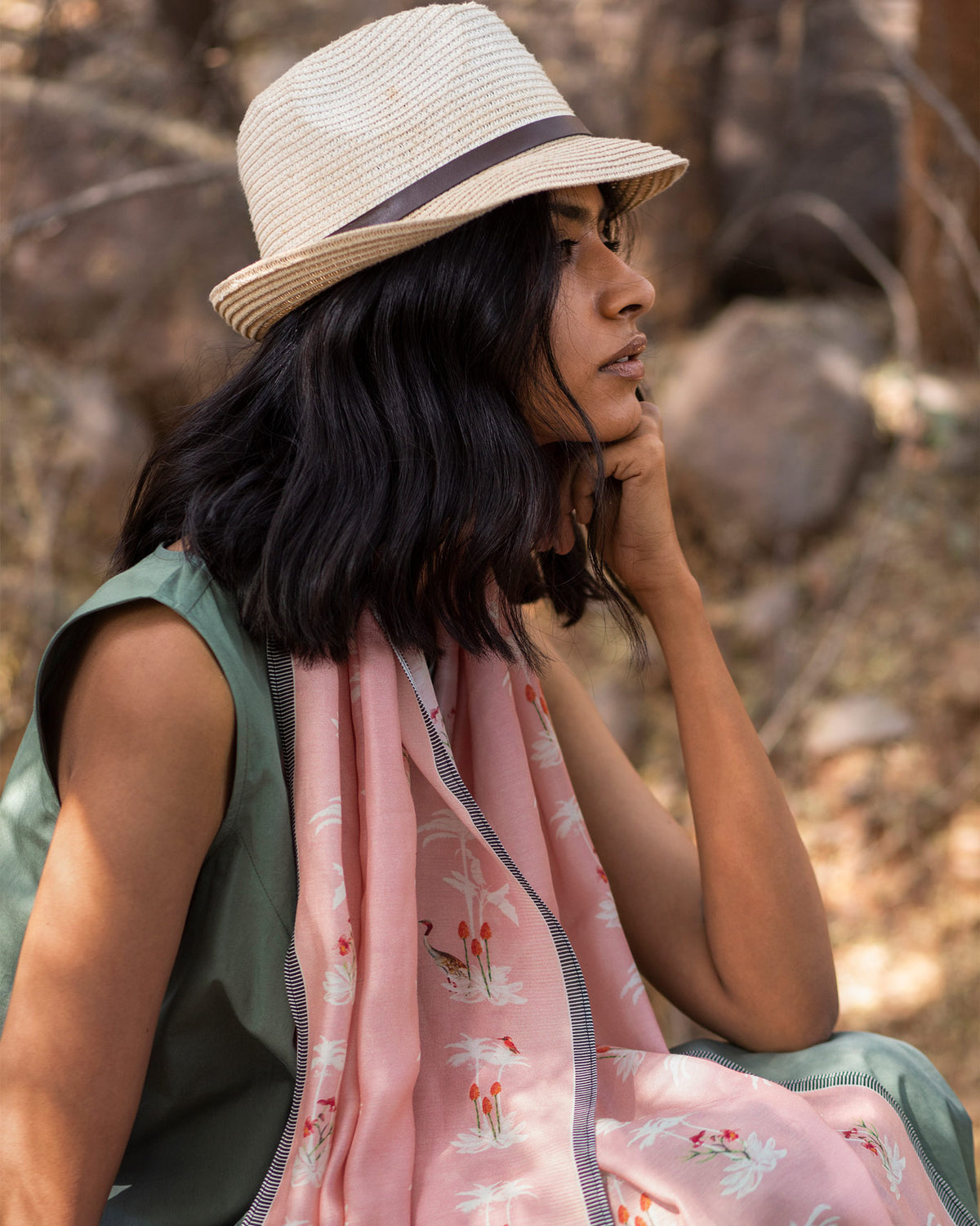 - Crafted in a dusty rose bemberg fabric, this scarf feautures a white foliage print