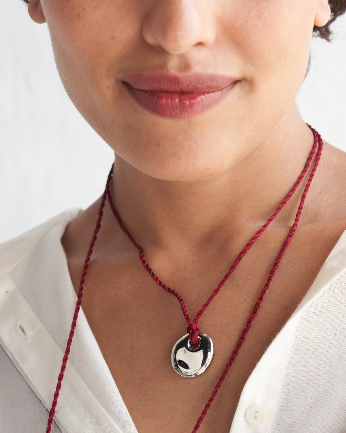 - Made from lightweight abstract castings of brass, the cotton cord is in red.
