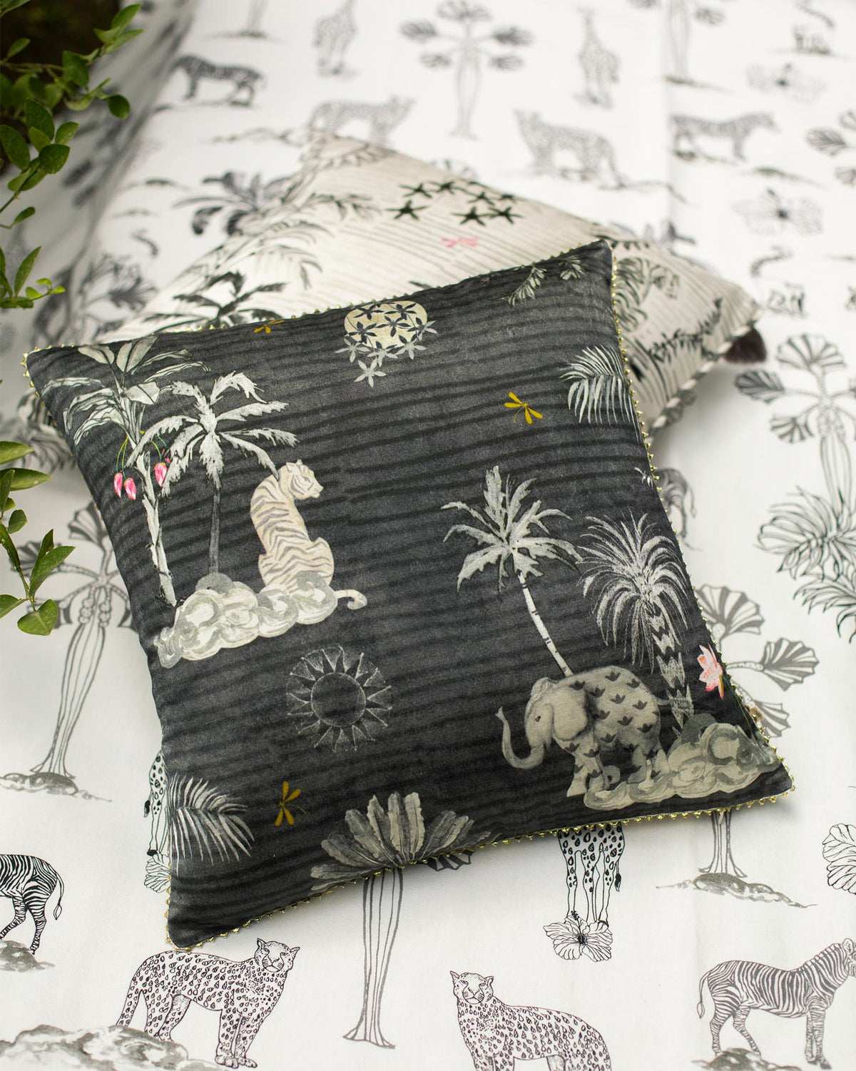 - A monochromatic cushion with motifs inspired by the flora & fauna found along India's Malabar coast
