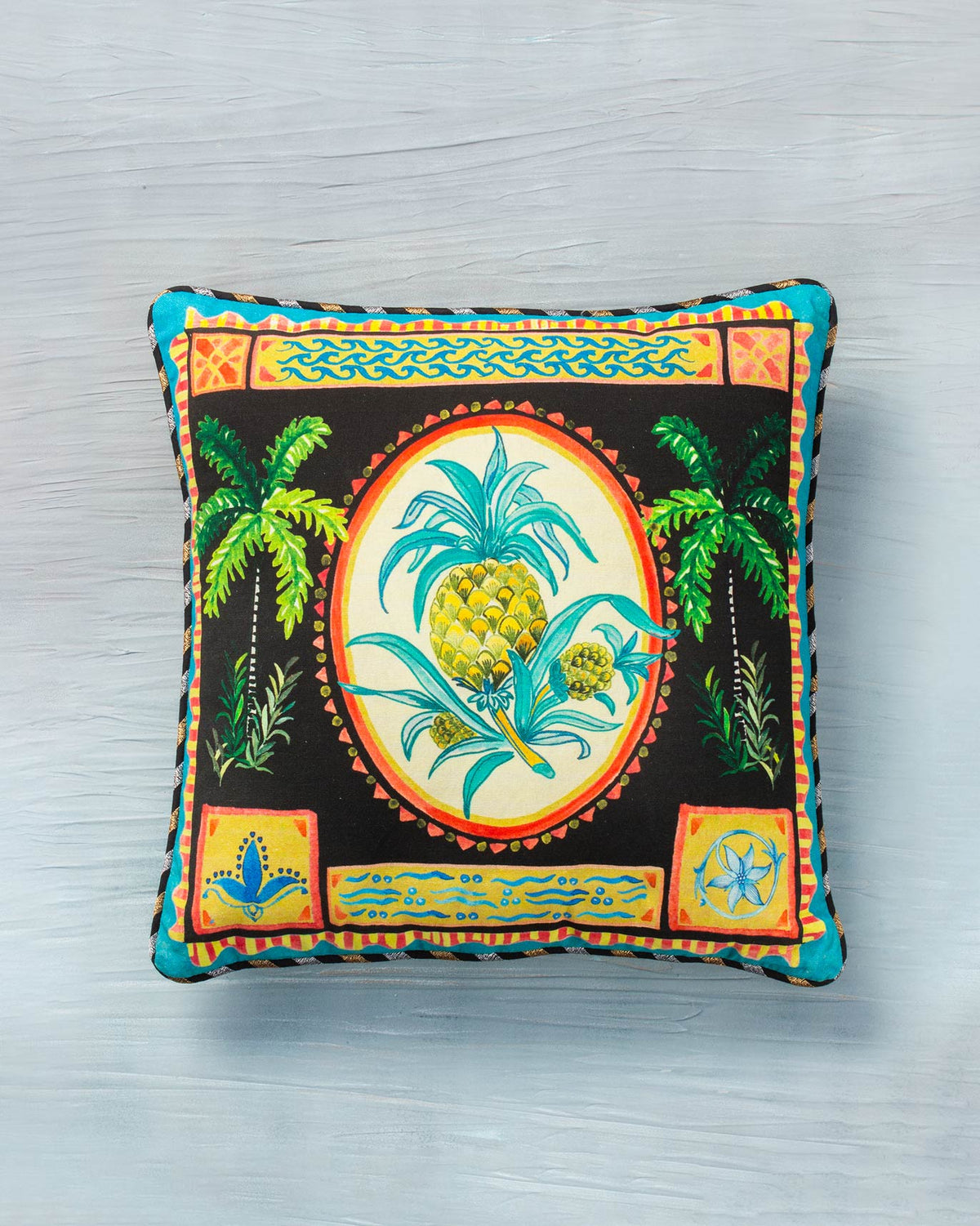 - With candy-striped cord piping, this cushion features Nicobar's signature pineapple and palm trees that are reminiscent of the tropics